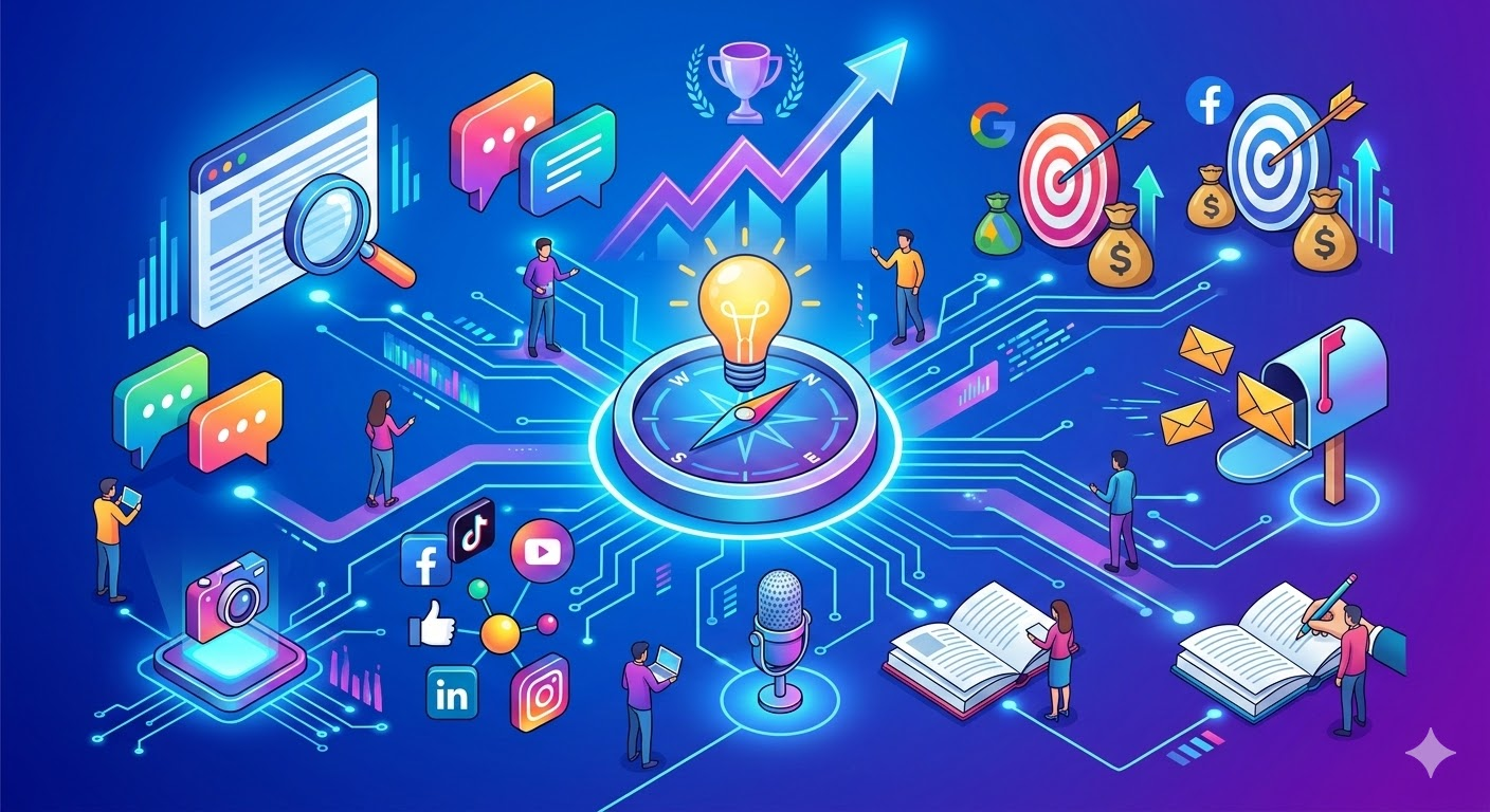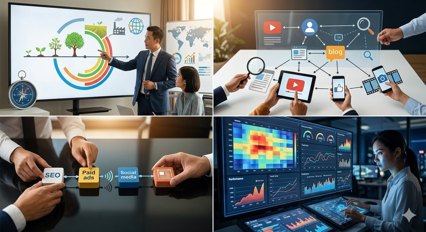 Sự kết hợp giữa SEO, quảng cáo, mạng xã hội và content marketing giúp doanh nghiệp tiếp cận khách hàng ở nhiều điểm chạm.